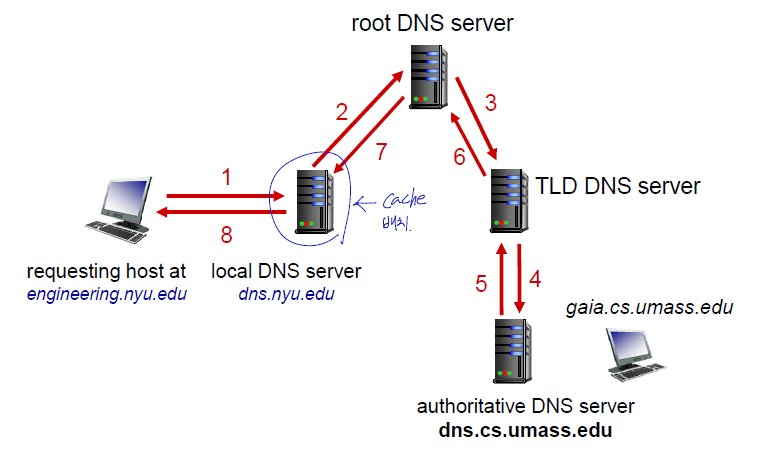 - host가 DNS query를 만들면, querys는 local DNS server로 보내짐.