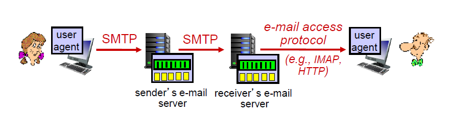 - HTTP : gmail, Hotmail, etc. 웹에 기반한 STMP, IMAP(또는 POP) interface를 제공한다.
