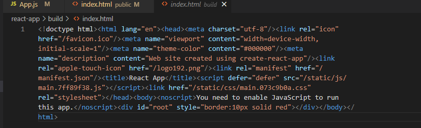 이 코드를 실행하면 build라는 폴더가 생기고 그곳에 index.html 파일이 생긴다.